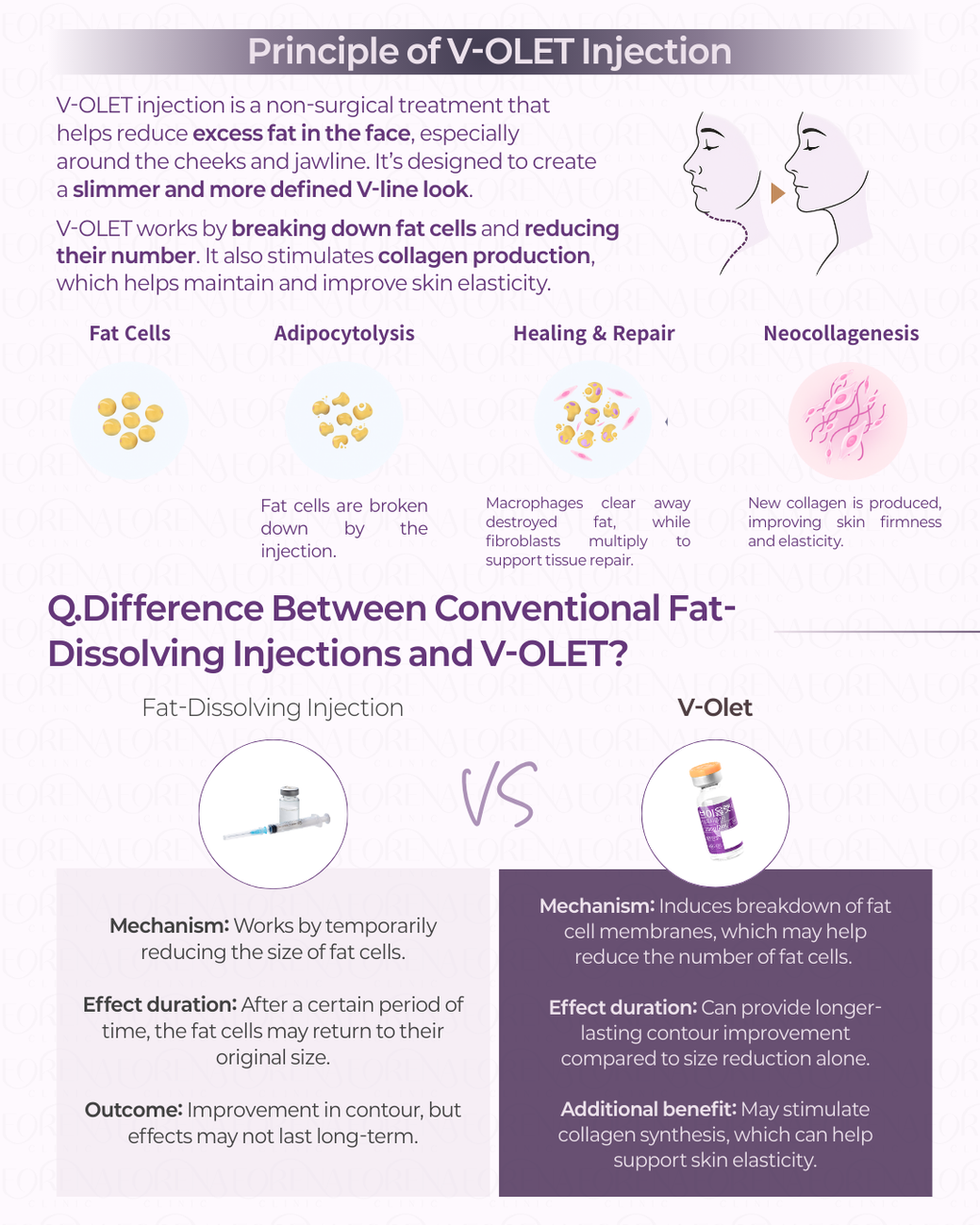 V-OLET is a fat-dissolving injection that works by breaking down fat cells in targeted areas, such as the double chin and jawline. Unlike conventional contour injections that only shrink the size of fat cells, V-OLET induces adipocytolysis (destruction of fat cell membranes), which may help reduce the number of fat cells.